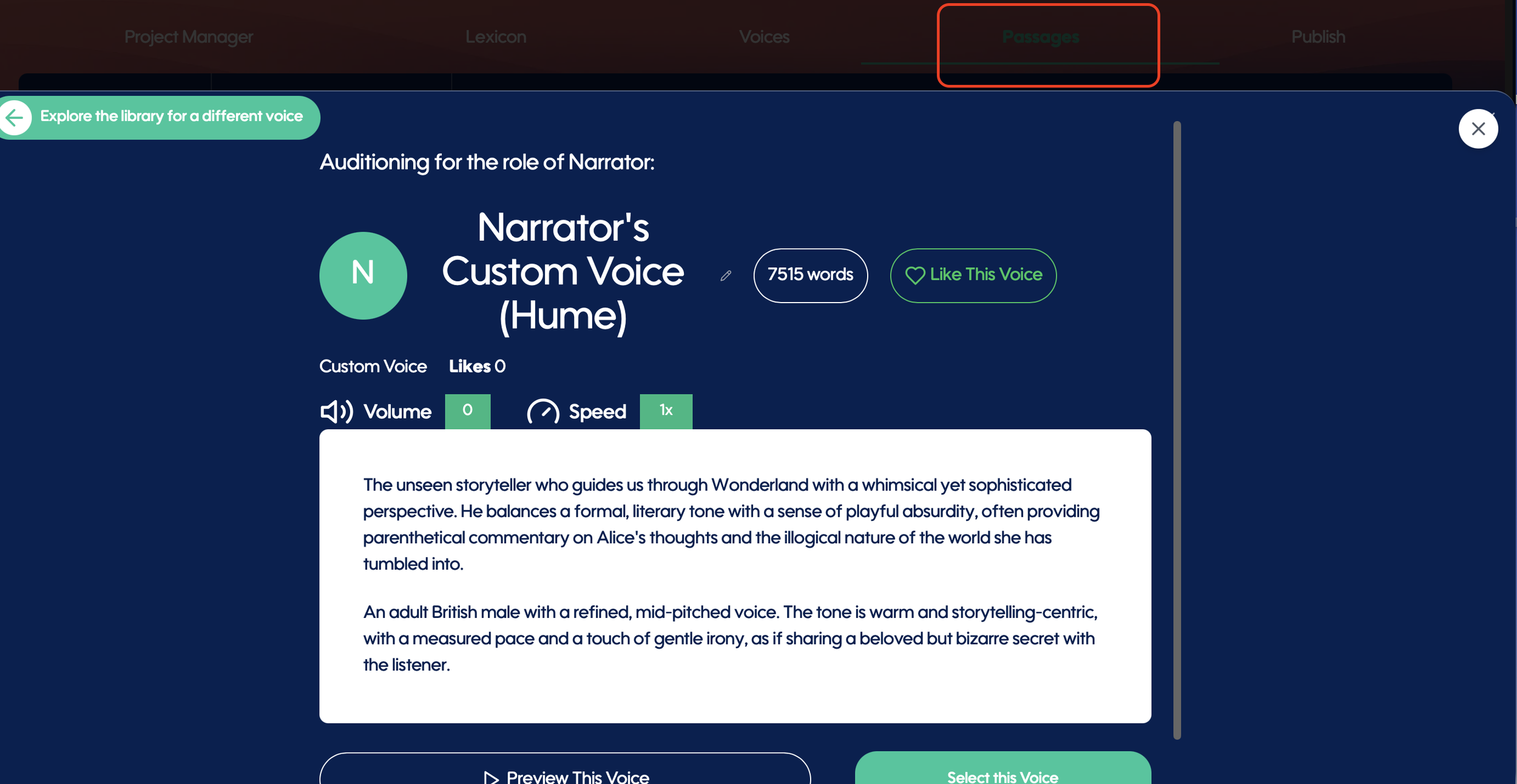Clicking a character name at the top of the Passages tab now opens that character’s voice profile directly.