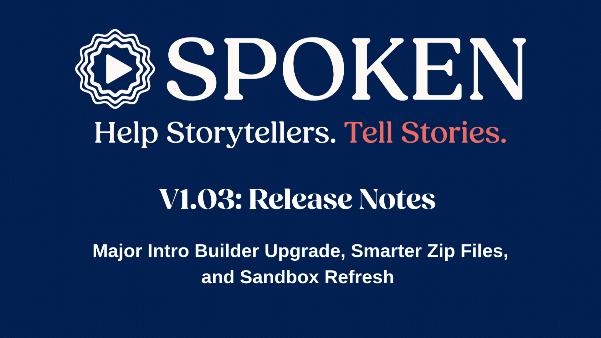 Spoken is leveling up once again. With this V1.03 release, we’ve completely reimagined how authors build project introductions, making them flexible, modular, and distribution-ready from the very first passage. We’ve also streamlined how ZIP exports are organized with automatic installment numbering and rolled out stability fixes to improve playback performance.